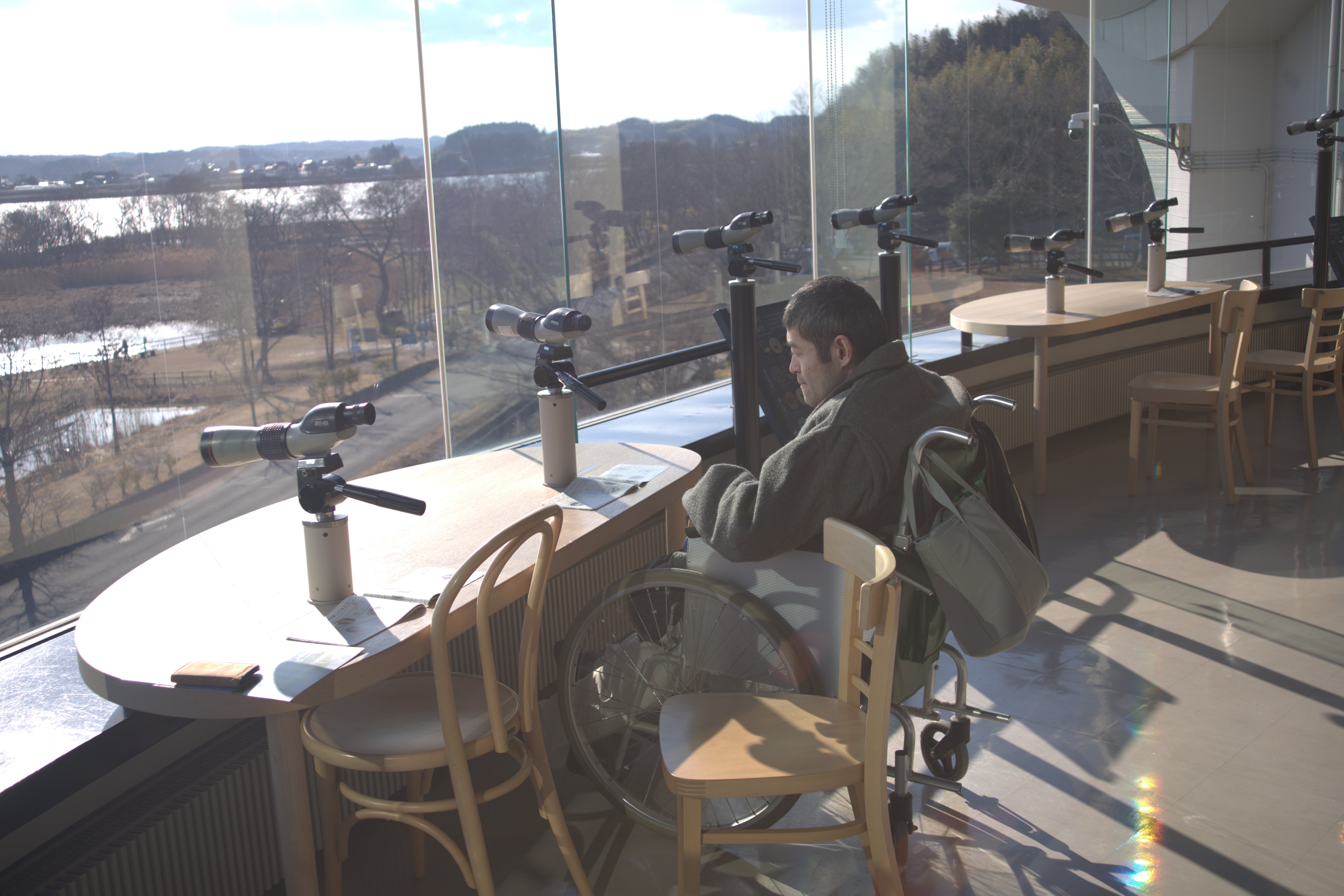 伊豆沼・内沼を望む展望席には望遠鏡が並んでおり、車いすユーザー向けであろう、低い位置に設置された望遠鏡もありました。しかし、ここの車椅子によっては、低い位置に設置された望遠鏡が合わず、覗くことはできないことも想定される。