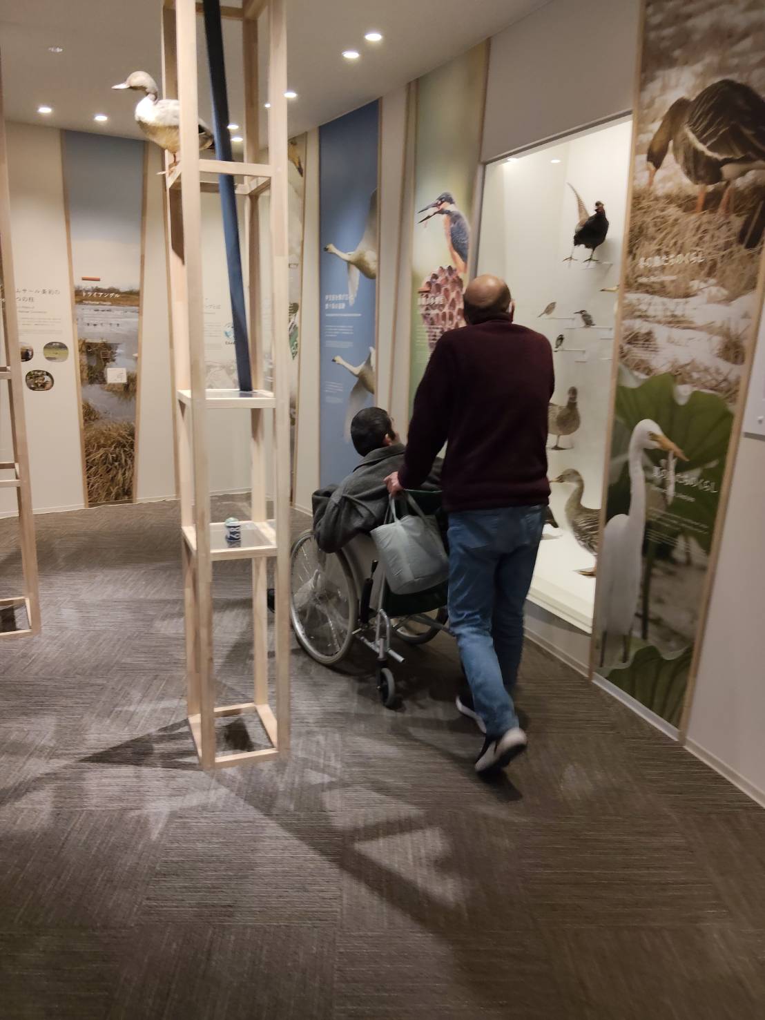 館内通路は平坦で広く、車いすでも楽に動けました。2階へ続くエレベーターは、6人乗りで少々狭く感じます。館内には段差もあったが、誂えたスロープが設置してあります。