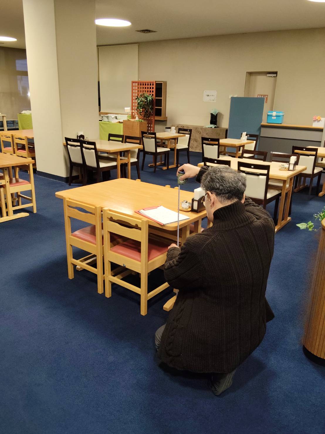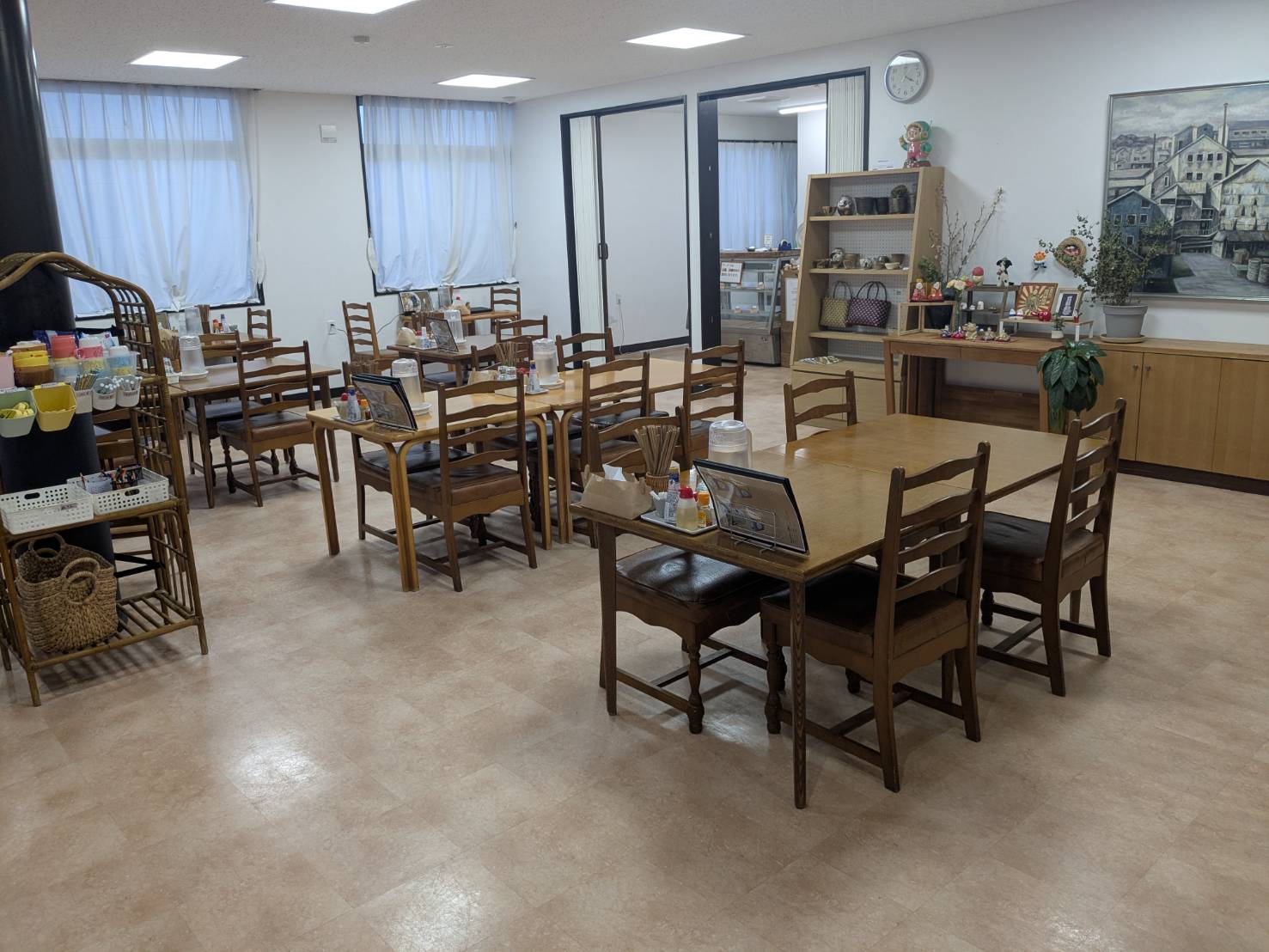 施設内には、食堂・喫茶スペースがありました。机・椅子は可動式で、通路も広めに取られていました。