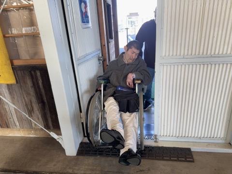 ミュージアムに入る"改札"(入場口)を通り、最初の建屋の出入り口が、扉の両側に敷居の高さに合わせて市販の段差解消スロープが設置されていました。しかし、車いすで走行すると、短い距離で急に昇降することになり身体が前後に振られてしまいました。