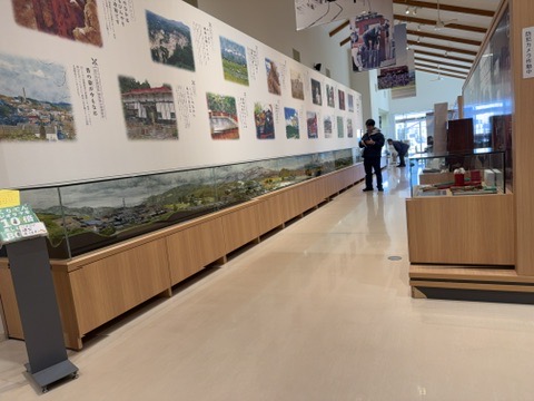 ジオパークのメインサイトである荒砥沢地すべりの模型。この他にも模型があり、周辺の地形が立体感をもって表現されていました。館内の展示の高さも車いすユーザーも見やすい位置となっていました。こうした凹凸の多い模型は触察模型にも適していると思います。