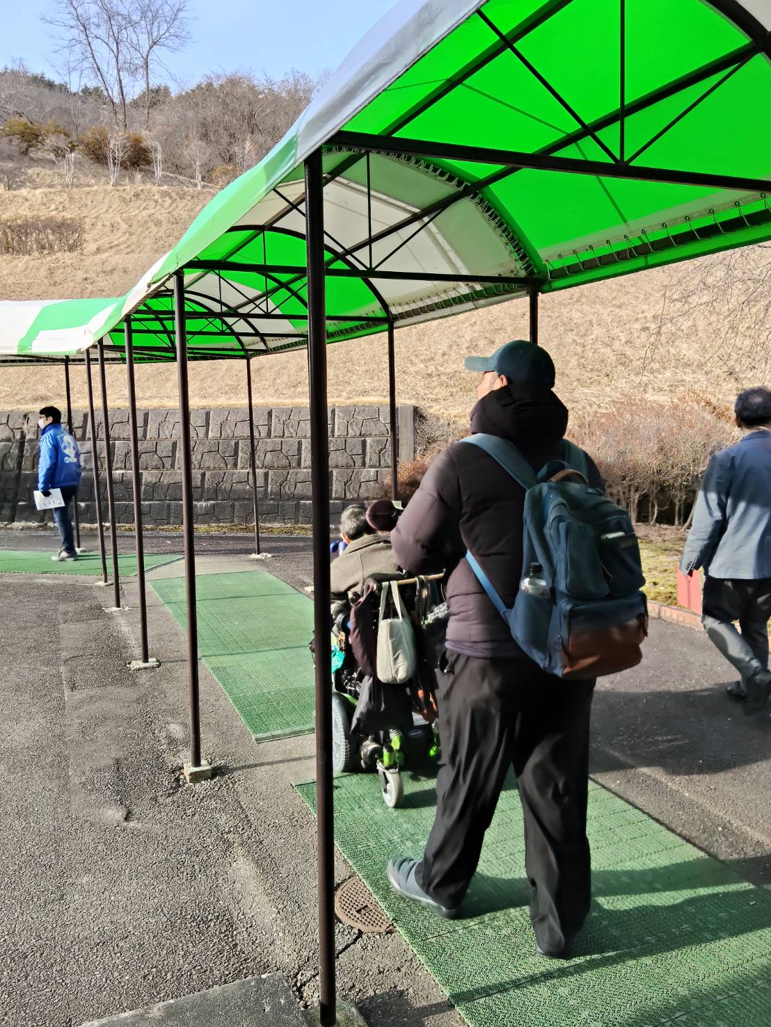 観光坑道への通路は、屋根がかけてあり雨や雪をしのげるようになっています。人工芝が引いてありますので、手動型の車いすでは、重たく感じるかも知れません。