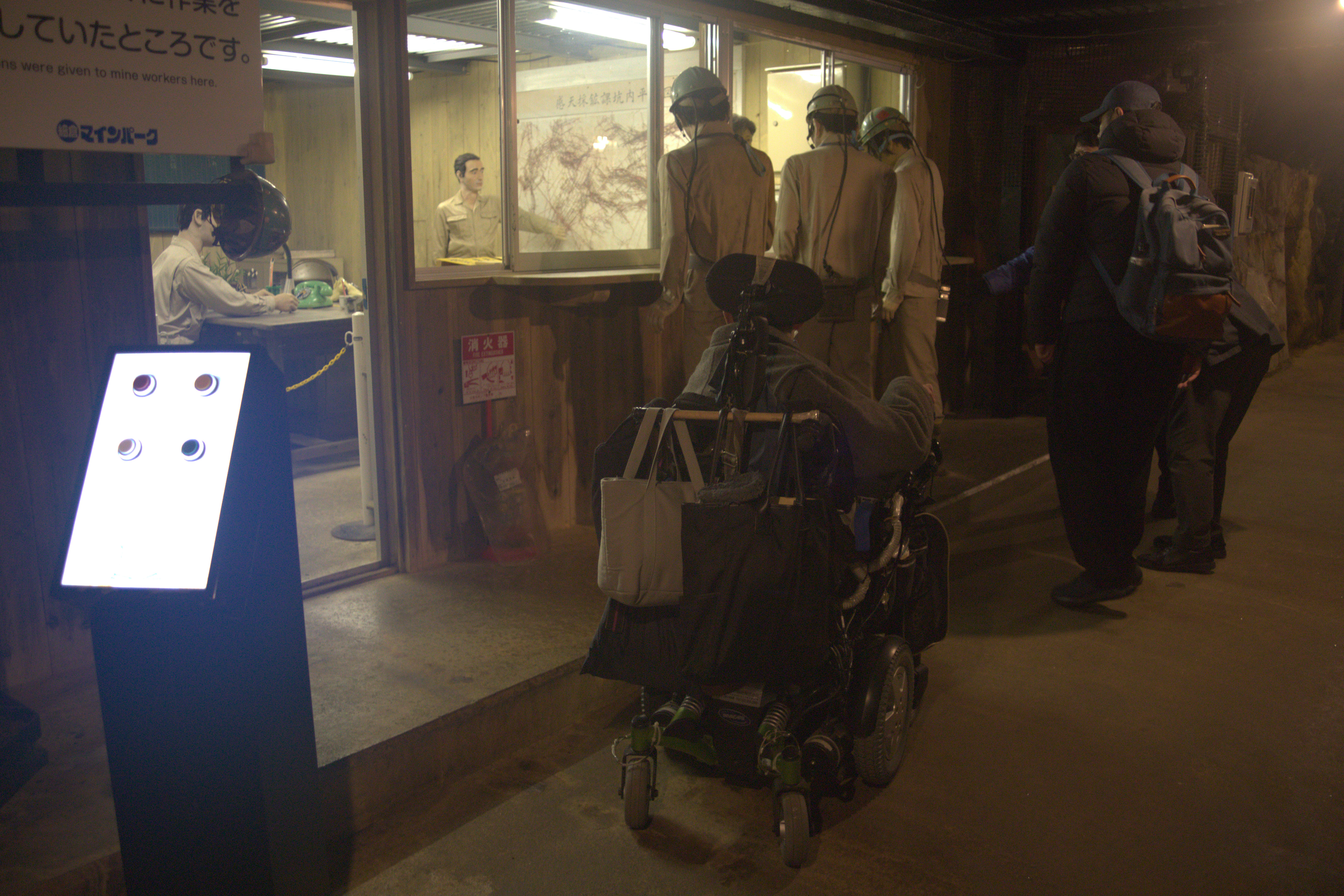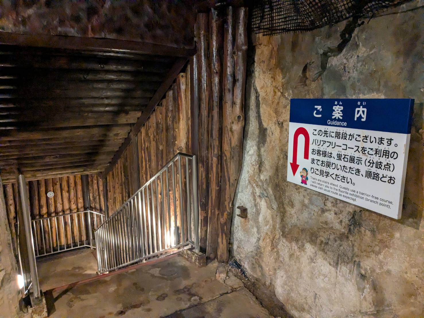 車いすで入れる、バリアフリーの坑道は、途中まででした。これ以降は階段を下っていくため車いすユーザーはここで引き返します。