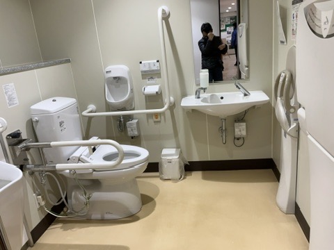 多目的トイレは、乳児用ベッドやオストメイト用設備が備わっていました。